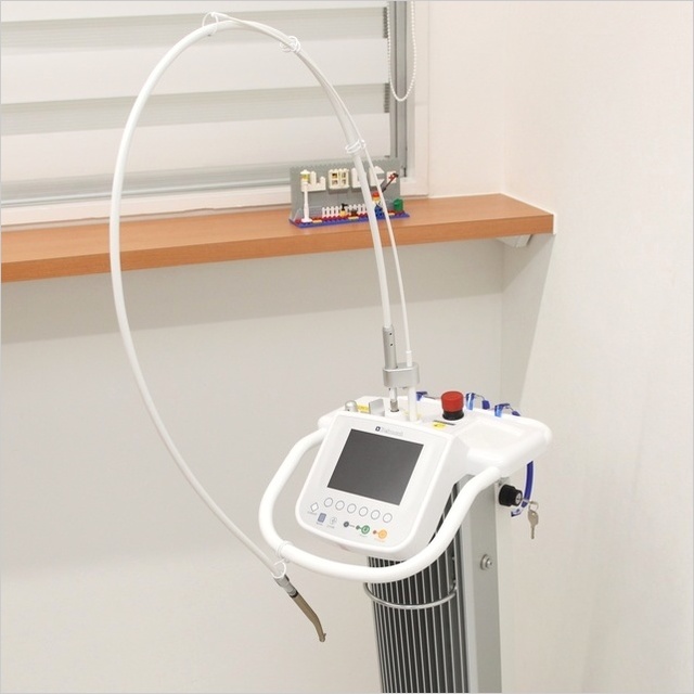 当院の歯周病治療で使用している「炭酸ガスレーザー」。歯と歯ぐきの間の歯周ポケットへこのレーザーを当てることで、歯周病の原因となる細菌を減らしていくという治療方法です。